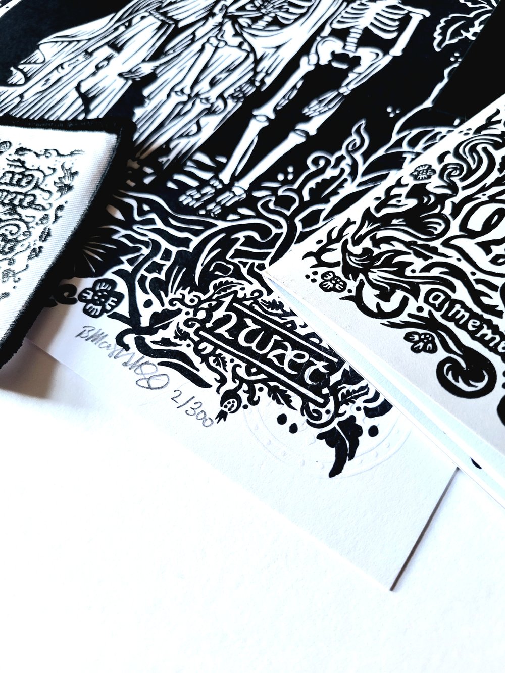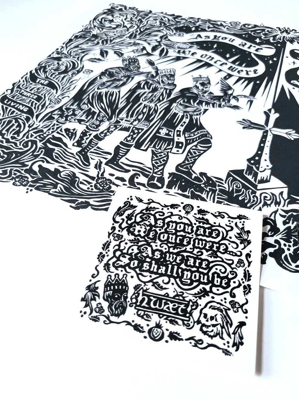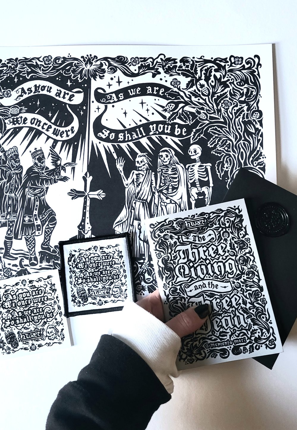 This bundle includes a signed, embossed and numbered art print, a screenprinted patch, a sticker and our A6 pocket zine which explores the story behind the medieval memento mori motif of The Three Living and the Three Dead.